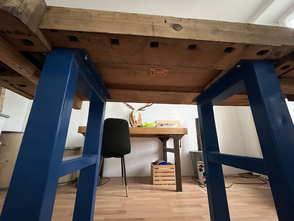 Grosser stabiler Werkbank zum Schnäppchenpreis inkl Metallfüsse (wurden angeschraubt) somit für Transport abnehmbar Länge: 214 cm Breite/Tiefe: 65,5 cm Höhe: 102cm