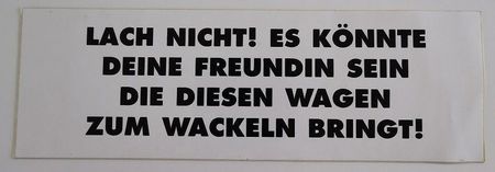 Lach nicht! Es könnte Deine Freundin sein, die diesen Wagen zum Wackeln bringt! Aufkleber PVC ca. 20 cm UV- und waschanlagenfest top Qualität ----------------------------------------------------------------------------------------------------------------------------------------- Beim Kauf von mehreren Artikeln können Sie Versandkosten sparen! Bezahlung via TWINT an die bei Ricardo hinterlegte Telefonnummer möglich.