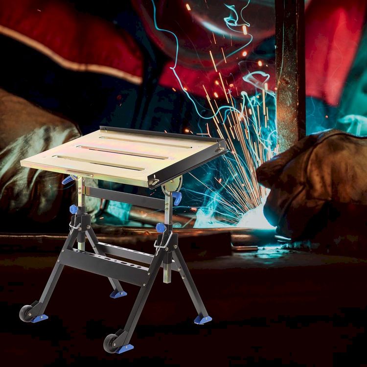 Table de soudage pliante jusqu’à 150kg Établi à roulettes réglable en hauteur D’une utilisation ultrapratique et d’une utilité inestimable, cette table de soudage pliante de la marque XPOtool va se faire bienvenir par tous les bricoleurs parce qu’elle se prête tant à des travaux de soudage et de brasage des plus variés qu’à une application comme établi conventionnel. Son dessus, mesurant 760 x 510 mm, est fabriqué en acier et comporte des trous découpés permettant la connexion d’une borne de masse et facilitant le perçage. La table de soudage, ayant une capacité de charge max. de 150 kg, est bien préparée même à des projets lourds – pris à la lettre ! Afin que le dessus de table convienne à votre projet individuel, son inclinaison se règle à une valeur allant de 0° à 90°. De surcroît, la table peut aussi être réglée en hauteur, s’ajustant sur quatre hauteurs comprises entre 735 mm et 860 mm. À ce propos, son dessus est équipé de deux butoirs actionnés grâce au principe de la vis à levier. Pour ce faire, vous pouvez absolument garder vos gants de soudeur, qui ne vous embarrasseront pas non plus quand vous réglez l’inclinaison. La table de soudage, ayant des dimensions extérieures de 775 x 670 mm, trouve sa place dans presque chaque atelier ; ses petits rouleaux vous permettent de la déplacer aisément. Par surcroît, elle est pliante, donc peu encombrante quand vous la rangez dans un coin. La poignée intégrée assure que la table se transporte sans problème jusqu’à l’endroit où est requise sa présence. Dans la partie inférieure de la table de soudage, il y a deux barres avec des trous découpés, qui gardent pour vous les outils que vous devez utiliser souvent. De cette manière, vous avez sous la main vos tournevis, pinces ou autres outils. Spécifications