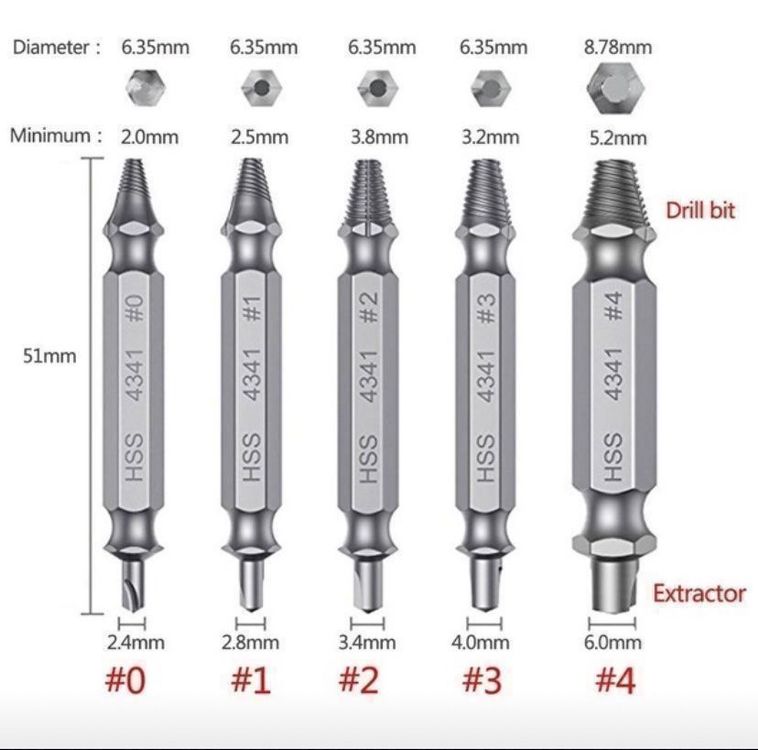 1 Set a 5 Stück! Top Angebot Top Qualität Beschädigter Schraubenentferner und Abziehersatz! Beschreibung: Gebrauchsanweisung: 1.Wählen Sie einen Schraubenentferner, der kleiner als die Schadensschraube ist. Verwenden Sie einen Bohrer, um ein Loch in der Mitte des Schraubenkopfs tief genug zu drehen. Hinweis: Je tiefer das Loch ist, desto einfacher ist es, die Schraube zu entfernen. 2. Nehmen Sie den Schraubenentferner heraus und drehen Sie den Schraubenzieher um 3. Der Handbohrer wird zum Bohren langsam gegen den Uhrzeigersinn gedreht, jedoch kein Hochgeschwindigkeitsbohren. Eine gute Werkzeugwahl für jemanden, der gerne Handarbeit oder Projekte macht. Material: HSS Größe des beschädigten Schraubenentferners: Schraubenzieher # 0 Durchmesser 2 ~ 3mm Schraubenextraktor Nr. 1 Durchmesser 3 ~ 5 mm Schraubenextraktor Nr. 2 Durchmesser 4 ~ 8 mm Schraubenextraktor Nr. 3 Durchmesser 5 ~ 10 mm Schraubenextraktor Nr. 4 Durchmesser 6 ~ 12 mm