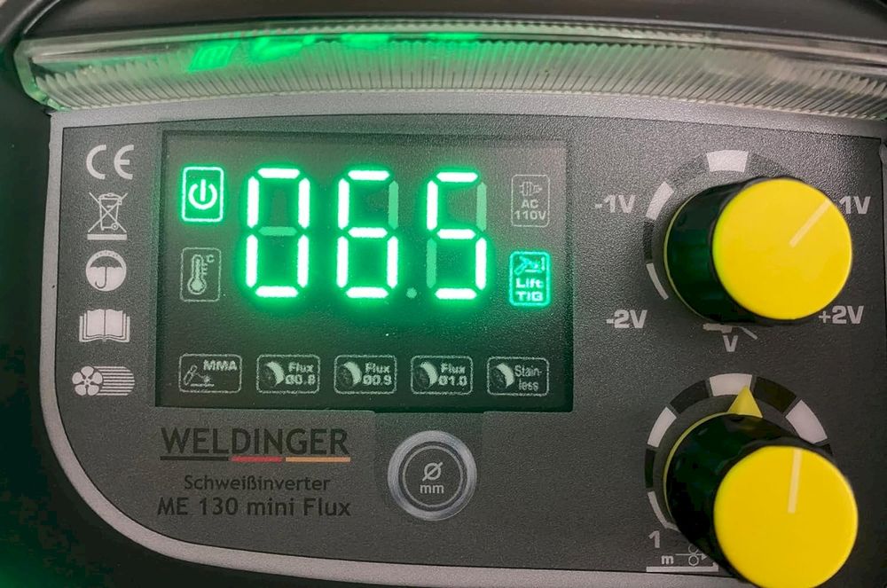 MAG-Fülldrahtschweißgerät WELDINGER ME 130 mini FLUX mit MMA-Funktion im Set Important! Pour utiliser ce produit, un socle électrique suisse T23 16A avec trous carrés est exigée (ce produit possède une fiche allemande, mais un Fix-adapter suisse T23 16A est inclus dans lemballage). Mit diesem kompakten Fülldrahtschweißgerät bietet Ihnen WELDINGER einen einfachen Einstieg in die Welt des MAG-Schweißens. Der Vorteil bei der Verwendung von Fülldraht besteht darin, dass das Gerät auch im Außenbereich verwendet werden kann und ohne extern zugeführtes Schutzgas auskommt. Über zwei Regler lassen sich Schweißstrom, Drahtvorschubgeschwindigkeit und Spannungsfeineinstellung bequem regeln. Ideal für Schweißanfänger und Gelegenheitsschweißer.Dieser kompakte Schweißinverter bietet dank seiner abnehmbaren Schweißkabel und des zusätzlichen Elektrodenhalterkabels höchste Flexibilität beim Schweißen. Verwendbar sind entweder 1 kg-Schweißdrahtrollen Fülldraht oder rutile Stabelektroden.Passendes Zubehör für den Brenner, günstige Fülldraht-Angebote und Schweißelektroden zum Elektrodenhandschweißen finden Sie in unserem Shop. Spécifications Netzspannung 230 V/50 HzGerätetyp IGBT-InverterEinschaltdauer 30%/130 A 100%/71 ALeerlaufspannung 65 VGewicht mit Schweißkabeln und Netzkabel 7,5 kgAbmessungen (BxHxT) 230x270x390 mmKühlung LüfterSchutzklasse IP21Isolationsklasse FSchweißstrombereich 20-130 ADrahtführungsrolle Typ E Contenu de la livraison WELDINGER ME 130 mini FLUX Kombischweißgerät für MAG-Fülldraht und MMA- Schweißbrenner MB 150 2m lang, Massekabel 2m lang, Elektrodenhalterkabel 3m lang- 1 Rolle WELDINGER Fülldraht 0,8 mm (1 kg)- werkseitig verbaute Drahtrolle: Typ E 0,8/0,9 mm- je 1x Stromdüse 0,6-1,0 mm- 1x Fülldraht-Gasdüse